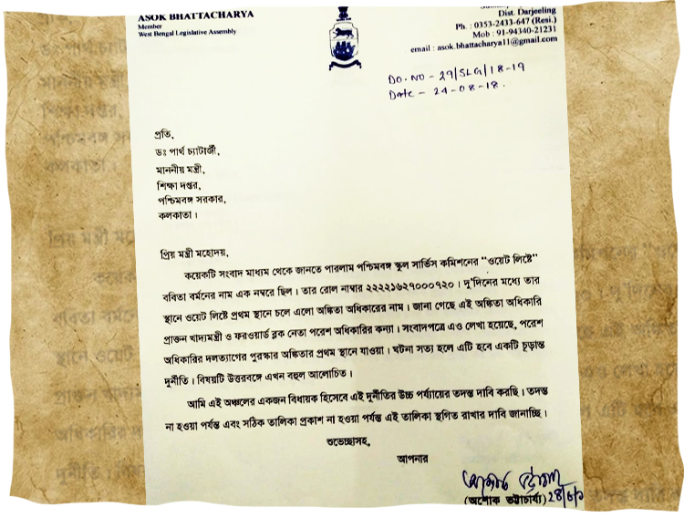 এ বার এই ঘটনাতেই উচ্চ পর্যায়ের তদন্তের দাবি করে রাজ্যের শিক্ষামন্ত্রী পার্থ চট্টোপাধ্যায়কে চিঠি দিলেন শিলিগুড়ির মেয়র-বিধায়ক অশোক ভট্টাচার্য। চিঠিতে প্রাক্তন পুরমন্ত্রী অশোকের বক্তব্য, কয়েকটি সংবাদ মাধ্যমে এই প্রকাশিত খবর সত্যি হলে এটি হবে চূড়ান্ত দুর্নীতি। উত্তরবঙ্গে এ নিয়ে ব্যাপক আলোড়ন ছড়িয়েছে। পাশাপাশি তিনি জানিয়েছেন, এই ঘটনায় বিচারবিভাগীয় তদন্তের প্রয়োজন। বিষয়টি তিনি বিধানসভাতেও তুলবেন বলে জানিয়েছেন অশোকবাবু।