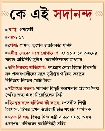 সদানন্দ অসমের প্রাক্তন শিক্ষামন্ত্রী হিমন্ত বিশ্বশর্মার বিশেষ ঘনিষ্ঠ বলে পরিচিত। কংগ্রেস নেতা হিমন্ত, অসমের প্রাক্তন প্রাক্তন ডিজি শঙ্কর বরুয়া-সহ সে রাজ্যের বহু প্রভাবশালী ব্যক্তির সঙ্গে টাকার বিনিময়ে সুদীপ্তর যোগাযোগ ঘটিয়ে দিয়েছিলেন তিনি এমনই জেনেছে সিবিআই। ইতিমধ্যেই হিমন্ত, শঙ্কর-সহ অসমের প্রাক্তন পরিবহণমন্ত্রী অঞ্জন দত্ত, কংগ্রেস সাংসদ মাতঙ্গ সিংহ, তাঁর প্রাক্তন স্ত্রী মনোরঞ্জনা সিংহের অফিস ও বাড়িতে তল্লাশি চালিয়েছে সিবিআই। কলকাতায় ডেকে এনে জিজ্ঞাসাবাদ করা হয় মনোরঞ্জনাকে। তদন্তকারীদের মতে, এদের সবার সঙ্গে সারদার যোগসূত্র ছিলেন সদানন্দই।