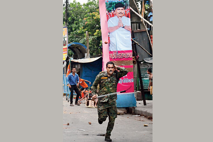 ধুন্ধুমার: ব্যারাকপুরের পুলিশ কমিশনার মনোজ বর্মাকে লক্ষ্য করে ছোড়া হচ্ছে ইট। ছবি: সজল চট্টোপাধ্যায়।
