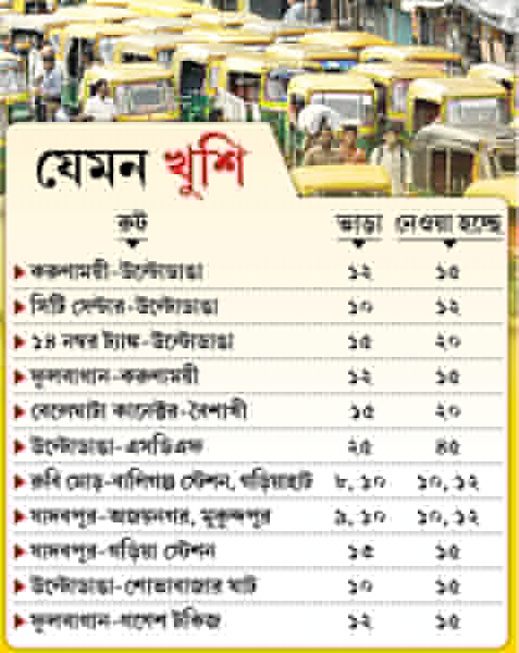 মন্ত্রীর আশ্বাসই সার। বেশির ভাগ রুটেই ইচ্ছে মতো ভাড়া নিলেন অটোচালকেরা। পুজোর আগে আর এক দফা ভাড়া বাড়ানোর হুমকিও দিয়ে রাখলেন। মন্ত্রীকে পাল্টা চ্যালেঞ্জ করে চালক থেকে মালিকেরা বললেন, ‘‘নেতা-মন্ত্রী চিনি না। আমরা গান বাজাব। যেমন বুঝব, তেমন ভাড়াও নেব। ক্ষমতা থাকলে কিছু করে দেখাক।’’