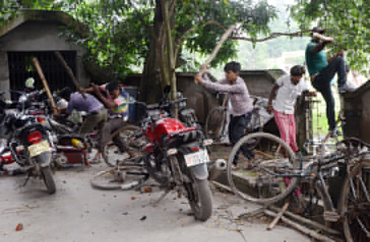 বহরমপুরে ভাঙচুর করা হচ্ছে বাইক। ছবি: গৌতম প্রামাণিক।
