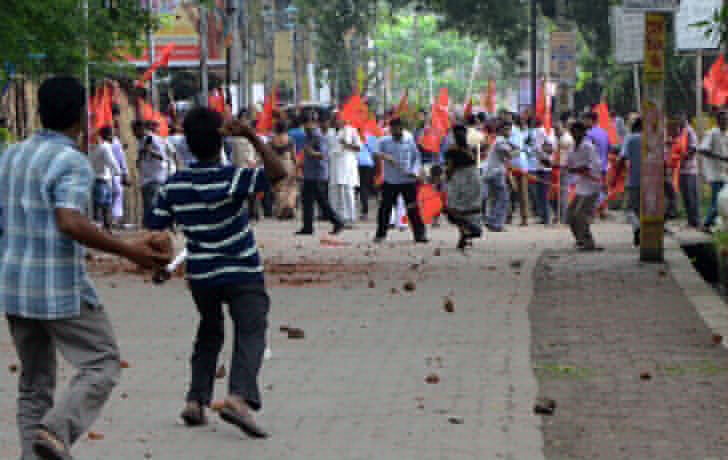 সিপিএম কর্মীদের দিকে ছোড়া হচ্ছে ইট। বহরমপুরে গৌতম প্রামাণিকের তোলা ছবি।