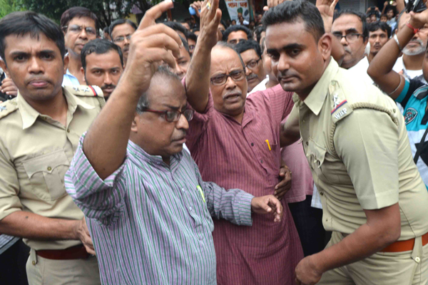 গ্রেফতার করা হচ্ছে মেয়র অশোক ভট্টাচার্যকে। ছবি: বিশ্বরূপ বসাক।
