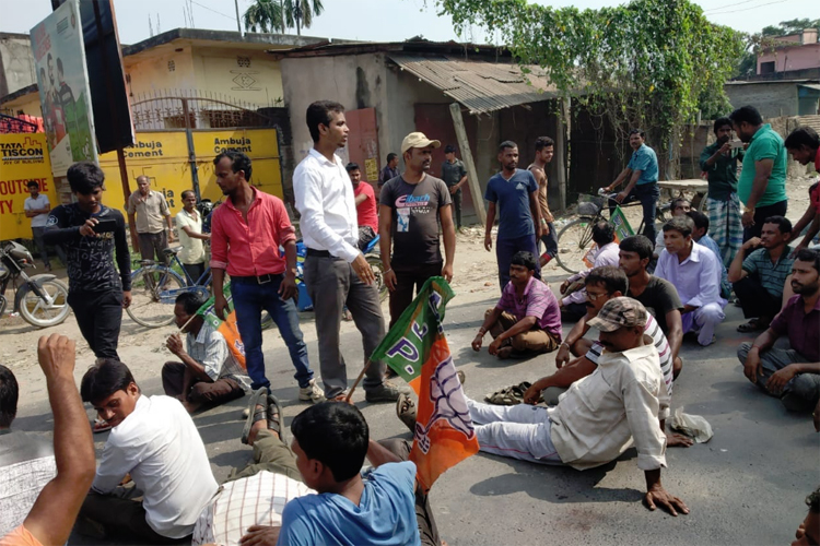 বিজেপি সমর্থকদের রাস্তা অবরোধ। —নিজস্ব চিত্র।