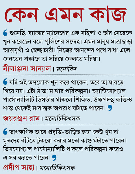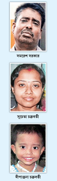 সুচেতা এবং সমরেশ, দু’জনের বাড়ির লোকই খবরের প্রাথমিক ধাক্কায় স্তম্ভিত। সুচেতার স্বামী, টাকি টাউন হাইস্কুলের ইংরেজির শিক্ষক শ্রুতিধর মুখোপাধ্যায় থাকেন বসিরহাটের কাছারিপাড়ায় এক ভাড়া বা়ড়িতে। সেখানে বসেই বারবার তিনি বলছিলেন, ‘‘আমার মেয়েটাকে এ ভাবে মেরে ফেলল!’’ তাঁর বক্তব্য, স্ত্রী আর মেয়ের খুনে অভিযুক্ত ব্যাঙ্ক ম্যানেজার সমরেশ সরকারকে তিনি চেনেন না। তবে সুচেতার সঙ্গে যে তাঁর দূরত্ব তৈরি হয়েছিল, সেটা মেনে নিয়েছেন।