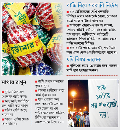 একদা চকোলেট বোমার বাজিমাত করা ‘ব্র্যান্ড’, দক্ষিণ শহরতলির শব্দবাজির বাজারে মৃত ‘বুড়ি-মা’ ফের প্রাণ ফিরে পেয়েছেন। ‘বুড়ি-মা’ চকোলেটের আওয়াজের সুখ্যাতি শুনতে শুনতে ওই কিশোরের সঙ্গে হাঁটা শুরু। মিনিট দশেক পরে রাস্তার পাশে সরু গলি দিয়ে কিছুটা এগিয়ে একটা বাড়ির সামনে এসে দাঁড়াল ছেলেটা। বাড়ির দরজায় ঘা দিয়ে বলল, ‘জেঠিমা, পার্টি আছে।’’ কিছুক্ষণ পরে দরজা খুলে বেরোলেন বছর পঞ্চাশের এক মহিলা। আগন্তুকের পা থেকে মাথা চোখ বুলিয়ে নিয়ে প্রশ্ন করলেন, ‘‘ক’প্যাকেট নেবেন?’’ বললাম, পাঁচ। পাশে দাঁড়ানো ছেলেটি বলল, ‘‘জেঠিমা, উনি ‘বুড়ি-মা’ নেবেন।’’ প্রায় ঘরের দিকে পা বাড়িয়েও ঘুরে দাঁড়ালেন মহিলা। বললেন, ‘‘দাম কিন্তু বেশি। সরাসরি কোম্পানির ঘর থেকে আনা। দারুণ জোরে ফাটবে।’’ তার পরে ডেকে নিলেন বাড়ির ভিতরে।