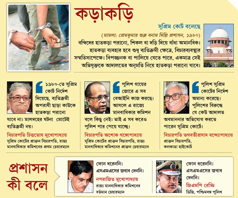 এবং এ প্রসঙ্গে সুপ্রিম কোর্টের প্রাক্তন বিচারপতি থেকে শুরু করে রাজ্য মানবাধিকার কমিশনের প্রাক্তন চেয়ারম্যান ও রাজ্যের মানবাধিকার কর্মীদের একটা বড় অংশ উল্লেখ করছেন চৌত্রিশ বছর আগে দেওয়া সর্বোচ্চ আদালতের নির্দেশটির কথা। সেখানে স্পষ্ট বলা হয়েছে, ব্যতিক্রমী ক্ষেত্র ছাড়া অভিযুক্তকে হাতকড়া পরানো যাবে না। ব্যতিক্রমী ক্ষেত্রেও হাতকড়া পরাতে হলে কোর্টের আগাম অনুমতি লাগবে। এই মহলের বক্তব্য, ১৯৮০-র নির্দেশটি এখনও বহাল। তা সত্ত্বেও বুধবার বাপিকে হাতকড়া পরিয়ে রাজ্যের পুলিশ যে শুধু শীর্ষ আদালতের নির্দেশ অমান্য করেছে তা-ই নয়, মানবাধিকার-বিধিরও তোয়াক্কা করেনি।