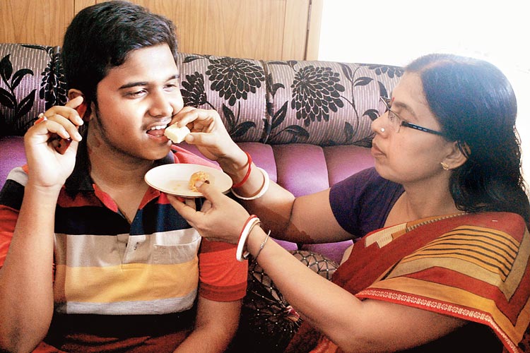 মায়ের হাতে মিষ্টিমুখ তিমিরবরণের। ছবি: উদিত সিংহ