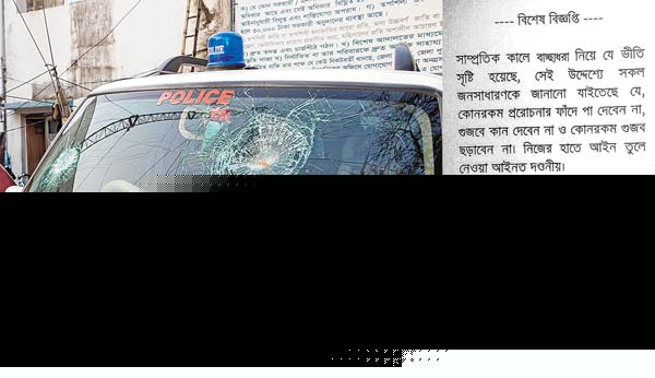 ভেঙেছে পুলিশের গাড়ি। প্রশাসনের বিলি করা লিফলেট। নিজস্ব চিত্র।