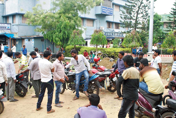 কামনাড়ায় ব্লক অফিসের বাইরে মোটরবাইক নিয়ে জটলা। সোমবার। নিজস্ব চিত্র