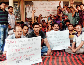 রানিগঞ্জে মাইনিং কলেজে দিনভর অবস্থান-বিক্ষোভ প্রাক্তন পড়ুয়াদের। ছবি: ওমপ্রকাশ সিংহ।