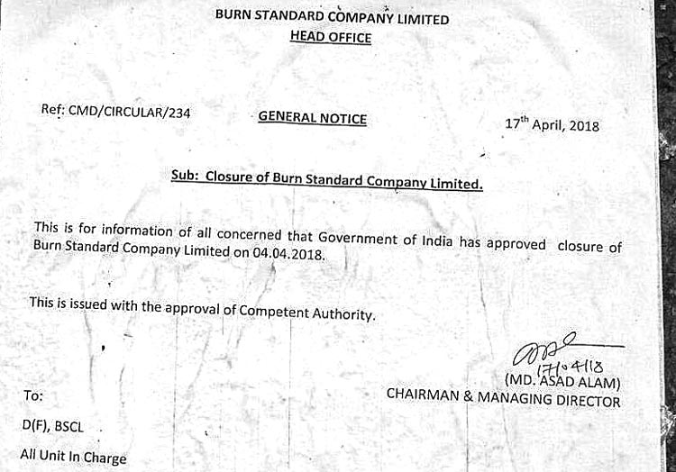 শেষমেশ পড়েই গেল নোটিস। কারখানা বন্ধের বিজ্ঞপ্তি ঝুলিয়ে দেওয়া হল বার্ন স্ট্যান্ডার্ড কারখানায়। বুধবার বার্নপুরে ওই নোটিসের খবর পেয়ে কারখানার গেটে জটলা করেন শ্রমিক-কর্মীরা। সংস্থার জেনারেল ম্যানেজারের দফতরের সামনেও ভিড় করেন অনেক।