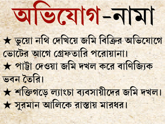 জানা গিয়েছে, তোলাবাজির অভিযোগের আগে সুরমান আলিকে রাস্তায় মারধরের অভিযোগ ছিল গোলামের নামে। এ ছাড়াও ভুয়ো নথি দেখিয়ে এক ব্যক্তিকে জমি বিক্রি করার অভিযোগে নির্বাচনের আগে গ্রেফতারি পরোয়ানা জারি করেছিল বর্ধমান জেলা আদালত। তার সঙ্গে রয়েছে পাট্টা দেওয়া জমি দখল করে পঞ্চায়েতের বাণিজ্যিক ভবন তৈরির অভিযোগ। এ নিয়ে আদালতে মামলাও চলছে। আদালতের নির্দেশে ভূমি ও ভূমি সংস্কার দফতরের কর্তারা সরেজমিন তদন্ত করে রিপোর্ট জমা দিয়েছেন। সেখানে তাঁরা অভিযোগের সত্যতা রয়েছে বলে আদালতকে জানিয়েছেন। পুলিশের এক কর্তা বলেন, “ভাইকে সামনে রেখে গোলাম জার্জিস ফল ঘোষণার পর থেকে একের পর এক জমিতে তৃণমূলের পতাকা পুঁতে দখলের চেষ্টা করছিল। গোটা এলাকা সন্ত্রস্ত করে তুলছিল। ল্যাংচা ব্যবসায়ীদের একাংশ এ নিয়ে আমাদের কাছে ও তৃণমূলের কাছে অভিযোগ করেছিলেন। এ ছাড়াও বর্ধমান উত্তর বিধানসভার মধ্যে গোলাম জার্জিসের নিজের পঞ্চায়েত হেরে যাওয়াটাও দল ভাল চোখে দেখেনি।”