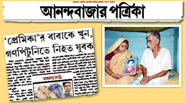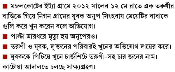 ২০১২ সালের ১২ মে রাতে মঙ্গলকোটের ইট্যা গ্রামে অনুপ সিংহরায় নামে ওই যুবককে এই খুনের অভিযোগে বাড়ির মধ্যেই আটকে হাত-পা বেঁধে ফেলা হয়। তার পরে মারধর। ভোরে পুলিশ উদ্ধার করে হাসপাতালে নিয়ে যাওয়ার পথে মৃত্যু হয় তাঁরও। চার বছর আগের এই ঘটনায় খুন-পাল্টা খুনের অভিযোগ দায়ের করেছিল ওই তরুণী ও অনুপ, দু’জনের পরিবারই। পিটিয়ে খুনের মামলায় সাক্ষ্যগ্রহণ শুরু হয়েছে কাটোয়া আদালতে। গোটা ঘটনা নিয়ে এখন আর কোনও কথা বলতে রাজি নন তরুণীর পরিবার। কিন্তু ছেলেকে যারা খুন করেছে, তাদের শাস্তি চান অনুপের বৃদ্ধ বাবা-মা।