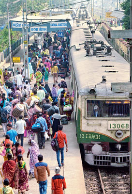 বন্ধের দিনে। সোমবার কাটোয়া স্টেশনে রোজকার মতোই ভিড়। নিজস্ব চিত্র।