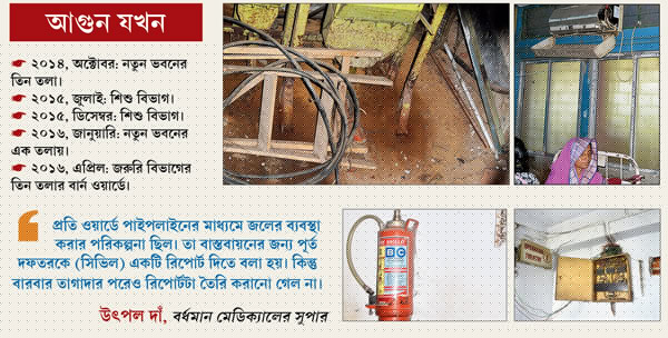 হাসপাতালে অগ্নি নির্বাপক ব্যবস্থা নিয়ে নিজেদের অসহায়তা গোপন করেননি হাসপাতাল কর্তৃপক্ষও। বর্ধমান মেডিক্যাল কলেজ হাসপাতালের সুপার উৎপল দাঁর কথায়, “প্রকল্পের অনুমোদন মিলছে না দেখে প্রতিটি ওয়ার্ডে পাইপলাইনের মাধ্যমে জরুরি ভিত্তিতে জলের ব্যবস্থা করার পরিকল্পনা নেওয়া হয়। পরিকল্পনার বাস্তবায়নের জন্য পূর্ত দফতরকে (সিভিল) একটি রিপোর্ট তৈরির জন্য বলা হয়। দমকলের আঞ্চলিক দফতরের কর্তারা হাসপাতাল ঘুরে দেখে যান। সবই হয়েছে, কিন্তু বারবার তাগাদা দেওয়ার পরেও রিপোর্টটা তৈরি করানো গেল না।’’ তবে পুরনো আমলের খোলনলচে বদলানোর কাজ শুরু হয়েছে বলে হাসপাতাল কর্তৃপক্ষের দাবি।
