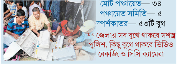 জেলা প্রশাসন সূত্রে জানা গিয়েছে, জেলার ৫৩টি বুথকেই স্পর্শকাতর ঘোষণা করা হয়েছে। প্রতিটি বুথেই থাকবে সশস্ত্র পুলিশ। এ ছাড়াও বেশ কিছু বুথে ভিডিও রেকর্ডিং ও সিসি ক্যামেরা থাকবে বলে জানা গিয়েছে। জেলা পুলিশ জানিয়েছে, প্রতিটি থানা এলাকায় এক জন করে ডিএসপি পদমর্যাদার অফিসার দায়িত্বে থাকবেন। রায়না ও খণ্ডঘোষে গোলামালের আশঙ্কা থাকায় শুক্রবার বিকেলে বর্ধমানের অতিরিক্ত পুলিশ সুপার (সদর) দ্যুতিমান ভট্টাচার্য, এসডিপিও (বর্ধমান) কার্তিক মণ্ডলের নেতৃত্বে রুট মার্চ হয়। রাতভর পুলিশ টহলের পরে শনিবার সকালেরও রুট মার্চ হবে বলে পুলিশের দাবি।