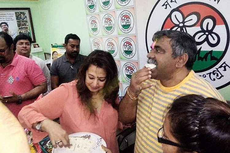 আসানসোলে দলীয় কার্যালয়ে মুনমুন সেন। —নিজস্ব চিত্র