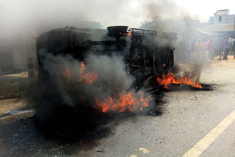 সাইকেলে করে স্কুলে যাচ্ছিল পড়ুয়ারা। নিয়ন্ত্রণ হারিয়ে পিছন থেকে ধাক্কা দেয় একটি ট্রাক। ঘটনাস্থলেই মৃত্যু হয় এক ছাত্রীর। গুরুতর জখম হয় আরও দু’জন। পুলিশের ‘তোলাবাজি’ এড়াতে বেপরোয়া ভাবে পালাতে গিয়ে ট্রাকটি দুর্ঘটনা ঘটিয়েছে, এই অভিযোগে ধুন্ধুমার বেধে গেল মেমারির রাধাকান্তপুরে। রাস্তা অবরোধ, পুলিশের গাড়িতে আগুন, আধিকারিকদের উপরে হামলা হল মঙ্গলবার দুপুরে। বিকেলে অবরোধ তুলতে পুলিশ লাঠি চালায় বলে অভিযোগ।