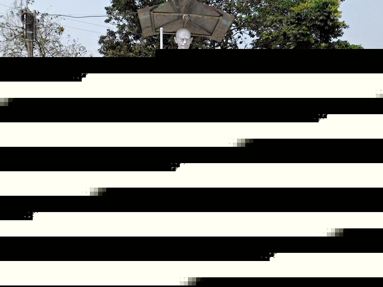 অহিংসার বার্তা দেওয়ার জন্য পঞ্চায়েতে এই মূর্তি বসিয়েছিলেন প্রধান সুকুর শেখ। ছবি: জাভেদ আরফিন মণ্ডল