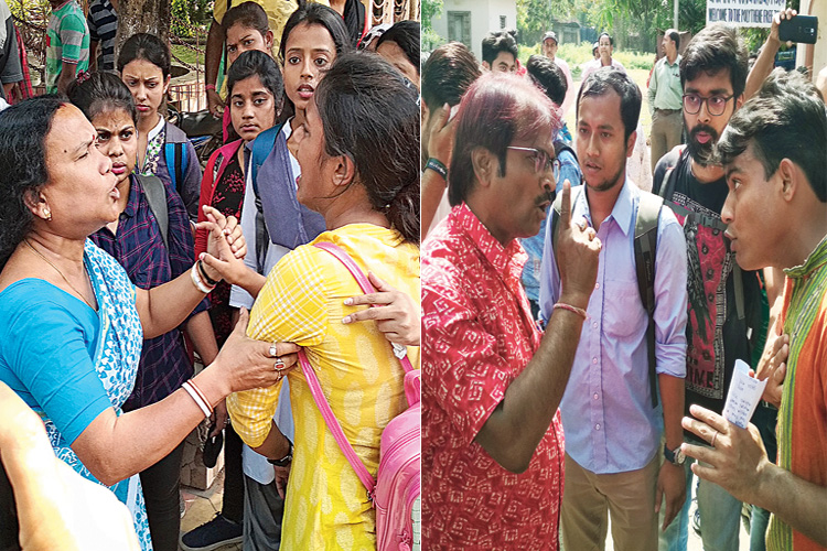 বিশ্ববিদ্যালয়ের কর্মীদের সঙ্গে ছাত্রছাত্রীদের বচসার দুই ছবি। নিজস্ব চিত্র