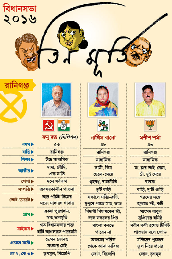 রানিগঞ্জ বিধানসভা কেন্দ্রের তিন প্রধান প্রার্থীর সম্পর্কে কিছু তথ্য এক নজরে।রানিগঞ্জ বিধানসভা কেন্দ্রের তিন প্রধান প্রার্থীর সম্পর্কে কিছু তথ্য এক নজরে।