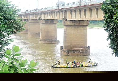 পলেমপুরে সেতুর নীচ দিয়ে চলছে বালিবোঝাই নৌকা।