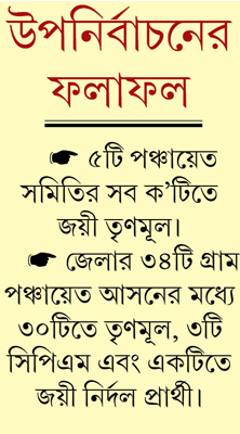 জেলার ৩৪টি গ্রাম পঞ্চায়েত ও ৫টি পঞ্চায়েত সমিতির আসনে নির্বাচন হওয়ার কথা ছিল। কিন্তু ১০টি পঞ্চায়েত ও ১টি পঞ্চায়েত সমিতির আসনে বিনা প্রতিদ্বন্দ্বিতায় জিতে যায় তৃণমূল। বাকি ২৪টি আসনের মধ্যে তৃণমূল ২০টি, সিপিএম ৩টি ও নির্দল একটি আসনে জয়লাভ করেছে। তৃণমূলের একাংশের দাবি, ওই এলাকাগুলির গোষ্ঠীদ্বন্দ্বই দলের হারের কারণ। কারণ কোথাও তৃণমূলের বিক্ষুদ্ধরা নির্দলকে সমর্থন করেছেন, আবার কোথাও সিপিএমকে।