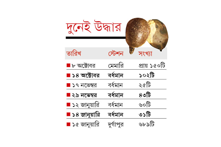 ২০১৮-য় ৮ অক্টোবর দুপুরে মেমারি স্টেশনে ডাউন দুন এক্সপ্রেসের সাধারণ কামরা থেকে ১১টি বস্তায় প্রায় দেড়শো কচ্ছপ উদ্ধার হয়। চার মহিলা-সহ পাঁচ জন ধরা পড়ে। তাঁদের জেরা করে পুলিশ জানতে পারে, উত্তরপ্রদেশের মানিপুর থেকে কচ্ছপগুলি এনে নদিয়ার চাকদহ নিয়ে যাওয়ার কথা ছিল। ১৪ অক্টোবর বর্ধমান স্টেশনে ওই ট্রেনে ছ’টি বস্তায় ১০২টি কচ্ছপ মেলে। ১৭ নভেম্বর, ২৯ নভেম্বর, চলতি বছরের ১২ ও ১৪ জানুয়ারি, কচ্ছপ উদ্ধার হয় বর্ধমান স্টেশনে, দুন এক্সপ্রেস থেকেই। মঙ্গলবারই দুর্গাপুর স্টেশনে দুন এক্সপ্রেস থেকে ২২টি বস্তায় ৬৮৯টি কচ্ছপ মেলে।