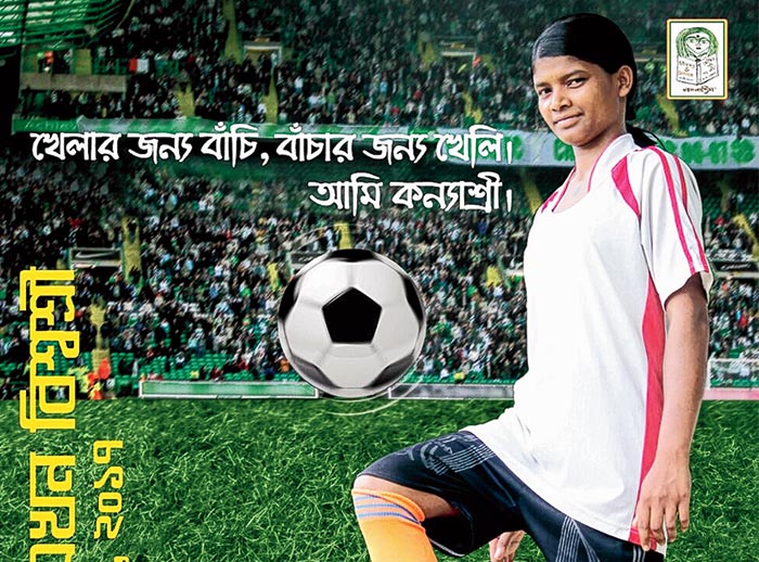 ভোর হলেই ফুটবল হাতে মাঠে ছোটে মেয়েটা। খাওয়া-দাওয়া, জামাকাপড়, এমনকী, বইপত্র না জুটলেও ফুটবল ছাড়া দিন কাটে না তার। মাঠের লড়াইয়েই জেলা প্রশাসনের কন্যাশ্রীর পোস্টারে জায়গা করে নিয়েছে মঙ্গলকোটের দাসী কিস্কু। গুসকরার সুস্মিতা রায়ও খেলার জোরেই ঠাঁই পেয়েছে পোস্টারে। তার হাতিয়ার কিক বক্সিং। শুক্রবার কন্যাশ্রীর আরও আট ‘পোস্টার গার্ল’র-এর সঙ্গে পুরস্কার পেয়েছে এই দু’জনও।