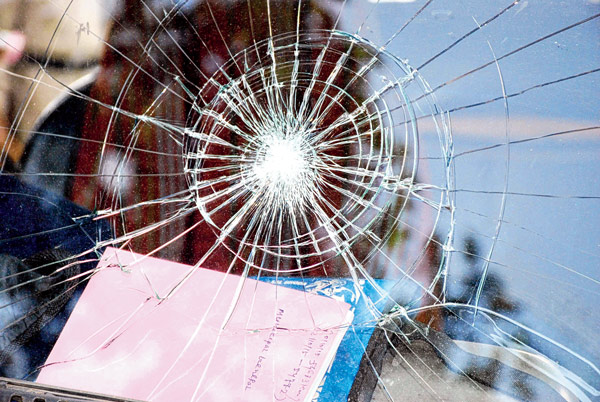 জামুড়িয়ায় গণ্ডগোল থামাতে গিয়ে ইটে ভাঙল পুলিশের গাড়ির কাচ। ছবি: ওমপ্রকাশ সিংহ।