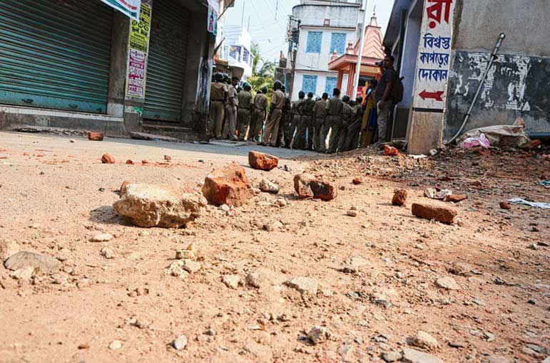 থানার কাছে বিক্ষোভ সামলাতে গিয়ে ইটবৃষ্টির মুখে পড়ে পুলিশ। নিজস্ব চিত্র।