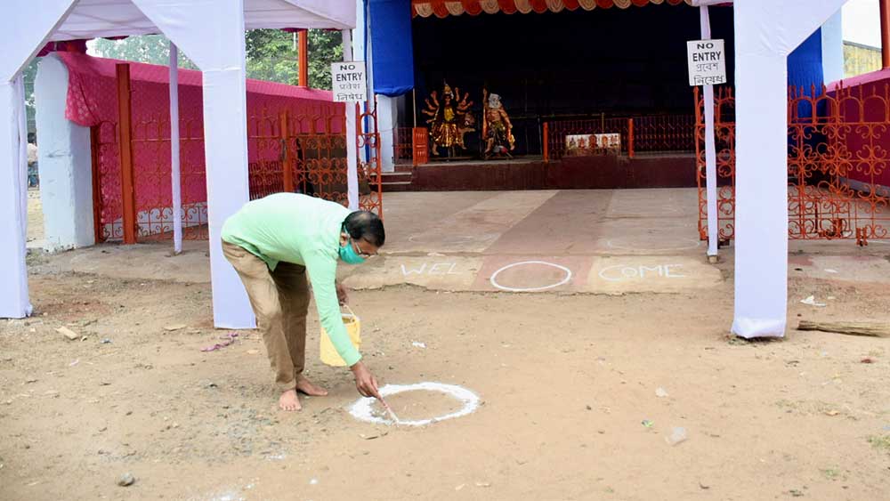আঁকা হচ্ছে সুরক্ষা বলয়। পাণ্ডবেশ্বরের খোট্টাডিহি কোলিয়ারি সর্বজনীনের মণ্ডপ চত্বর।