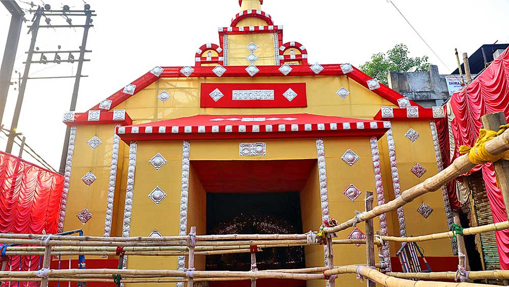 কোর্টের নির্দেশের পরেই বাঁশ দিয়ে ব্যারিকেড করে দেওয়া হয়েছে নিয়ামতপুরের মণ্ডপে। ছবি: বিশ্বনাথ মশান, ওমপ্রকাশ সিংহ, পাপন চৌধুরী
