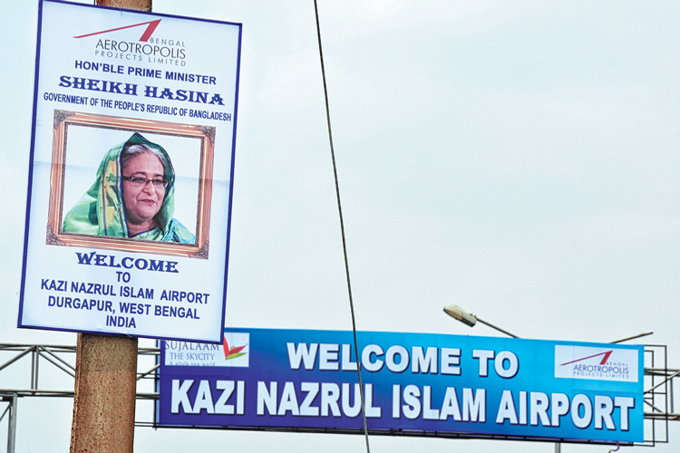 শুক্রবার প্রধানমন্ত্রী নরেন্দ্র মোদী বিশেষ বিমান এসে পানাগড় সেনা ছাউনিতে নামেন। সেখান থেকে হেকিকপ্টারে চড়ে তিনি যান শান্তিনিকেতনে, বিশ্বভারতীর সমাবর্তনে যোগ দিতে। আজ, শনিবার, অণ্ডালে নামবে বাংলাদেশের প্রধানমন্ত্রী শেখ হাসিনার বিশেষ বিমান। তার আগে শেখ হাসিনাকে স্বাগত জানাতে তৈরি এলাকা। ছবি: বিকাশ মশান