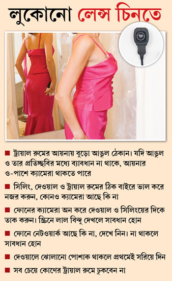 বিশেষজ্ঞেরা বলছেন, লুকোনো ক্যামেরার ক্ষেত্রে ইনফ্রা রেড প্রযুক্তি ব্যবহার করা হয়, যা দিয়ে অন্ধকারেও ছবি তোলা যায়। তবে পোশাক বিপণির ট্রায়াল রুমে লুকোনো ক্যামেরা থাকলে তা ধরার কিছু রাস্তাও রয়েছে। যেমন— এক, ট্রায়াল রুমের আয়নায় আঙুল ঠেকালে তা যদি তার প্রতিফলনের সঙ্গে জোড়া লেগে যায়, তবে বুঝতে হবে, আয়নাটিতে কোথাও কোনও গলদ রয়েছে। দুই, ট্রায়াল রুমের দেওয়াল এবং সিলিংয়ের দিকে মোবাইল ক্যামেরা তাক করুন। লুকোনো ক্যামেরা থাকলে মোবাইলের স্ক্রিনে লাল বিন্দু দেখা যাবে। তিন, কিছু ক্ষেত্রে লুকোনো ক্যামেরার কারণে ফাইবার অপটিক্‌স ফোনের নেটওয়ার্কে বিঘ্ন ঘটায়। সে ক্ষেত্রে ট্রায়াল রুমের ভিতর থেকে বাইরে ফোন করা যাবে না। এক সাইবার বিশেষজ্ঞ আরও বলেন, ‘‘ইদানীং স্মার্টফোনে লুকোনো ক্যামেরা ধরার কিছু অ্যাপ ডাউনলোড করা যায়, তবে সেগুলি কতটা কার্যকরী বা বিশ্বস্ত, তা নিয়ে প্রশ্ন রয়েছে।’’
