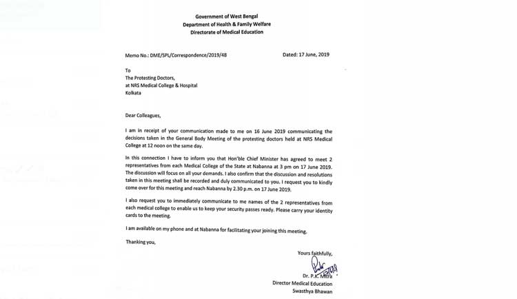 ওই আমন্ত্রণপত্রে অবশ্য মিডিয়ায় উপস্থিতি নিয়ে জুনিয়র ডাক্তারদের শর্তের উল্লেখ ছিল না। লেখা ছিল, প্রতিটা মেডিক্যাল কলেজ থেকে অন্তত ২ জন প্রতিনিধি মুখ্যমন্ত্রীর সঙ্গে এই বৈঠকে যোগ দিতে পারবেন। বেলা আড়াইটার মধ্যেই পরিচয়পত্র-সহ তাঁদের নবান্নে পৌঁছে যেতে হবে। এবং পুরো বৈঠকটা রেকর্ড করা হবে।
