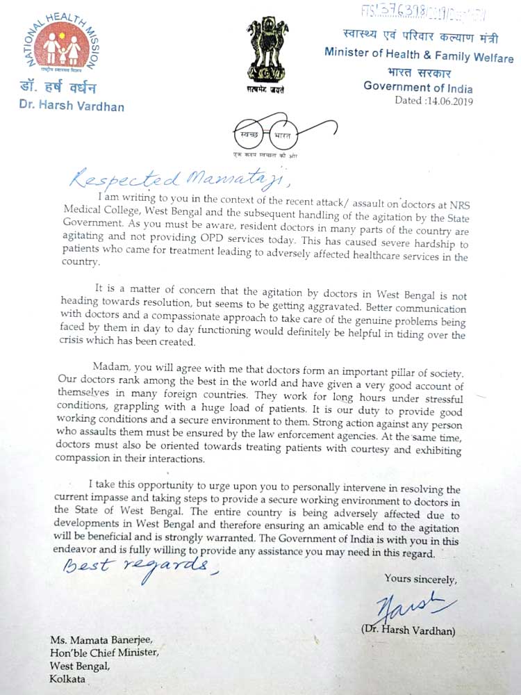 মমতার উদ্দেশে হর্ষ বর্ধন আরও লেখেন, ‘‘চিকিৎসকরা আমাদের সমাজের গুরুত্বপূর্ণ স্তম্ভ। সারা পৃথিবীর মধ্যে তাঁরা শ্রেষ্ঠ। তাঁদের মধ্যে অনেকেই বিদেশ সুনাম অর্জন করেছেন। ঘণ্টার পর ঘণ্টা অত্যন্ত চাপের মধ্যে কাজ করতে হয় তাঁদের। রোগীদের জন্যা সারা ক্ষণ সংগ্রাম করতে হয় তাঁদের। তাই কর্মক্ষেত্রে তাঁদের জন্য ভাল এবং নিরাপদ পরিবেশ তৈরি করা আমাদের কর্তব্যের মধ্যে পড়ে। ডাক্তারদের গায়ে হাত তুললে, নিগ্রহকারীদের বিরুদ্ধে আইনি ব্যবস্থা নেওয়া উচিত। সেই সঙ্গে ডাক্তারদেরও রোগীদের সৌজন্য দেখানো এবং তাঁদের প্রতি সহানুভূতিশীল হওয়া উচিত।’’ এই সঙ্কট থেকে বেরিয়ে আসতে ব্যক্তিগত ভাবে মমতা বন্দ্যোপাধ্যায়কে উদ্যোগীহতে অনুরোধ জানান হর্ষ বর্ধন। এ ব্যাপারে কেন্দ্রীয় সরকার তাঁকে সব রকম সাহায্য করতে প্রস্তুত বলেও জানান তিনি।