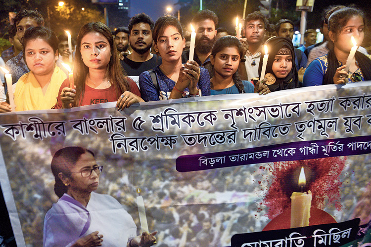 কাশ্মীরে পাঁচ বাঙালি শ্রমিক খুনের প্রতিবাদে শহরে তৃণমূল যুব কংগ্রেসের মিছিল। —নিজস্ব চিত্র।