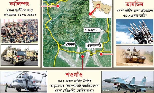 কালিম্পঙের সেনা-ছাউনি সম্প্রসারণেও বাদ সেধেছে জমি। সেনা-সূত্রের দাবি: সিকিমের তিব্বত-সীমান্তে ফৌজি নিরাপত্তার অন্যতম প্রধান স্তম্ভ হল কালিম্পঙের সেনা-ঘাঁটি। আপাতত সেখানকার ৪১৫ একরের ছাউনিতে প্রায় ১৩ হাজার সেনা মোতায়েন। বর্তমান পরিস্থিতির পরিপ্রেক্ষিতে প্রতিরক্ষা মন্ত্রক এটিকে আড়ে-বহরে তিনগুণ বাড়াতে চায়। যে জন্য কালিম্পঙের দূরবিনডারা এলাকায় ১২৫০ একর জমি রাজ্যের কাছে চাওয়া হয়েছে। এর মধ্যে ৮৩৩ একর রাজ্যকে অধিগ্রহণ করে দিতে হবে। কিন্তু কালিম্পংয়ের মহকুমা ভূমি-আধিকারিক সেনা-কর্তৃপক্ষকে জানান, অধিগ্রহণের ব্যাপারে রাজ্য সরকার কোনও সিদ্ধান্ত না-নেওয়ায় জমি জোগাড় করা সম্ভব হচ্ছে না।
