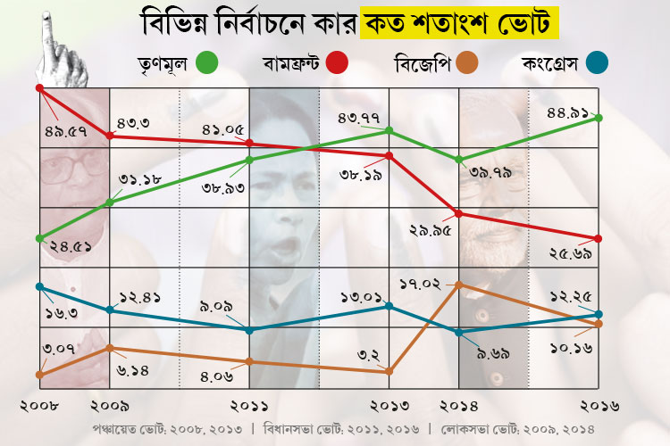এই মুহূর্তে রাজ্যে প্রধান যুযুধান চার। শাসক দল তৃণমূল ছাড়া রয়েছে বামফ্রন্ট, বিজেপি এবং কংগ্রেস। শেষ ১০ বছরের ছ’টা বড় ভোটে কারা কত শতাংশ করে ভোট পেয়েছে, সেই হিসেবই দেওয়া হল এখানে। দেখে নেওয়া যাবে সব পক্ষের ওঠানামার হিসেবও।