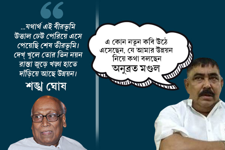 এর পাল্টা গিতে গিয়ে যেন শালীনতার গণ্ডি টপকে গিয়েছেন বীরভূমের তৃণমূল জেলা সভাপতি অনুব্রত মণ্ডল। তাঁর বক্তব্য, ‘‘বড় বড় কথা বলছেন কবি? এ কোন কবি? আমরা তো কবি বলতে জানতাম রবীন্দ্রনাথ, নজরুল। এ কোন নতুন কবি উঠে এসেছেন, যে আমার উন্নয়ন নিয়ে কথা বলছেন।’’ কিন্তু শঙ্খ ঘোষ যে মাপের কবি, তাঁকে নিয়ে শুধু তো রাজ্য নয়, গর্ব করে গোটা দেশ। সেই মানুষটাকেই ‘এ কোন নতুন কবি’ বলায় অনুব্রত মন্ডলের প্রজ্ঞা নিয়েই প্রশ্ন উঠে গিয়েছে। তৃণমূল পন্থী সুশীল সমাজের অবস্থা শাঁখের করাতের মতো। না পারছেন তাঁরা ব্যাপারটাকে গিলতে, না পারছেন উগরোতে। যদিও এ সবে আমল গিতে রাজি নন অনুব্রত । শঙ্খ ঘোষের বিরুদ্ধে গলা চড়িয়ে তিনি বলেছেন,‘‘কবির নাম শঙ্খ রাখা ঠিক হয়নি, শঙ্খ নামের অপমান করেছেন উনি। এখনও বলছি, রাস্তায় উন্নয়ন দাঁড়িয়ে আছে।’’
