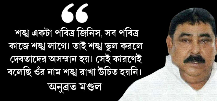 যদিও অনুব্রতর যুক্তি, তিনি তো শঙ্খ ঘোষকে অপমান করেননি, কোনও অসম্মানজনক কথা তো বলেননি।তিনি বলেছেন, ‘‘যখন অনুব্রত মণ্ডল রাস্তায় দাঁড়িয়ে থাকে, তখন শঙ্খ ঘোষ কবিতা লেখেন। কিন্তু, দিলীপ ঘোষ যখন বলেন ছাল চামড়া ছাড়িয়ে নেব, নুন-লঙ্কা মাখিয়ে দেব, একশো জনকে শ্মশানে পাঠিয়ে দেব, তখন তো শঙ্খ ঘোষ কিছু লেখেন না। শঙ্খ একটা পবিত্র জিনিস, সব পবিত্র কাজে শঙ্খ লাগে। তাই শঙ্খ ভুল করলে দেবতাদের অসম্মান হয়। সেই কারণেই বলেছি ওঁর নাম শঙ্খ রাখা উচিত হয়নি।’’