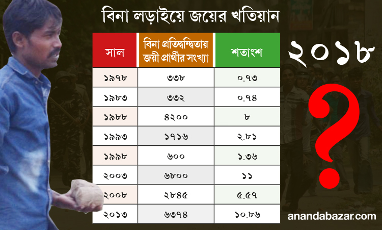 তৃণমূল জমানা শুরু হওয়ার পর রাজ্য দ্বিতীয় বার পঞ্চায়েত নির্বাচনের মুখোমুখি। ২০১৩ সালের পঞ্চায়েত নির্বাচনেও অনেক আসন বিনা প্রতিদ্বন্দ্বিতায় জিতে নিয়েছিল তৃণমূল— মোট আসনের ১০.৮৬ শতাংশ। তবে, বিনা প্রতিদ্বন্দ্বিতায় জয়ের সে হার বেনজির ছিল না। কারণ ২০০৩ সালের পঞ্চায়েত নির্বাচনে ১১ শতাংশ আসন বামেরা দখল করে নিয়েছিলেন বিনা যুদ্ধে। বামেদের সেই নজিরকেও ছাপিয়ে গিয়েছে এ বারের তৃণমূল।