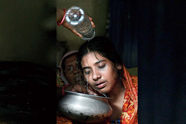 স্বামীহারা: ভাঙড়ে নিহত হাফিজুলের স্ত্রী সাবিরা বিবি। শনিবার। ছবি: সুমন বল্লভ।