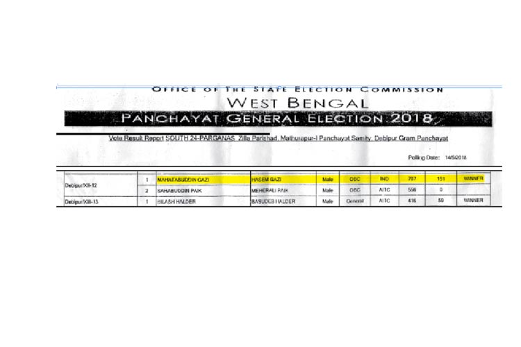 মথুরাপুরে দেবীপুর গ্রাম পঞ্চায়েতের ভোটে নির্দল প্রার্থী হিসেবে দাঁড়িয়েছিলেন একদা তৃণমূল মহতাবুদ্দিন গাজি। ২০০৮ এবং ২০১৩ সালের নির্বাচনে তৃণমূলের টিকিটে জয়ী হয়েছিলেন তিনি। অভিযোগ, এ বারের নির্বাচনের আগে দল তার কাছে টাকা দাবি করে। মহতাবুদ্দিনের ভাষায়, ‘‘টিকিট বিক্রি করতে চেয়েছিল তৃণমূল। রাজি হইনি। নির্দল প্রার্থী হিসেবে মনোনয়ন জমা দিই।’’ ১৭ মে নির্ধারিত সময়ে ভোট গণনা কেন্দ্রে পৌঁছন মহতাবুদ্দিন। গণনার পর তাঁকে জানিয়ে দেওয়া হয়, বিপক্ষ তৃণমূলের সাহাবুদ্দিন পাইক তাঁর কাছে ১৫১ ভোটে পরাজিত হয়েছেন। এর পর গণনাকেন্দ্র থেকে বেরিয়ে যান মহতাবুদ্দিন। অভিযোগ, এর খানিক পরেই তৃণমূলের সাহাবুদ্দিন পাইককে জয়ের সার্টিফিকেট দেওয়া হয়। জানানো হয় ৭ ভোটে জিতেছেন সাহাবুদ্দিন।