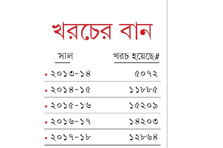 পঞ্চায়েত দফতরের তথ্য বলছে, ২০১৩-’১৪ থেকে ২০১৭-’১৮ সাল পর্যন্ত ৫ বছরে পঞ্চায়েত দফতর বিভিন্ন প্রকল্পে ৫৯ হাজার ২৪৩ কোটি টাকা খরচ করেছে। এই টাকা পুরোটাই খরচ হয়েছে রাজ্যের ৩৩৪৪টি গ্রাম পঞ্চায়েতে। ৫ বছরে গড়ে একটি গ্রাম পঞ্চায়েত ১৭.৭১ কোটির কাজ করেছে। বছরে যা সাড়ে তিন কোটির বেশি। পঞ্চায়েত দফতরের এক কর্তার কথায়,‘‘বছরে সাড়ে তিন কোটির বেশি একটি গ্রাম পঞ্চায়েতে খরচ হওয়াটা বড় কথা নয়, এর মধ্যে অন্তত ২ কোটি টাকা এক জন গ্রাম প্রধান নিজের হাতে খরচ করেন। সেটাই আসল মজা।’’