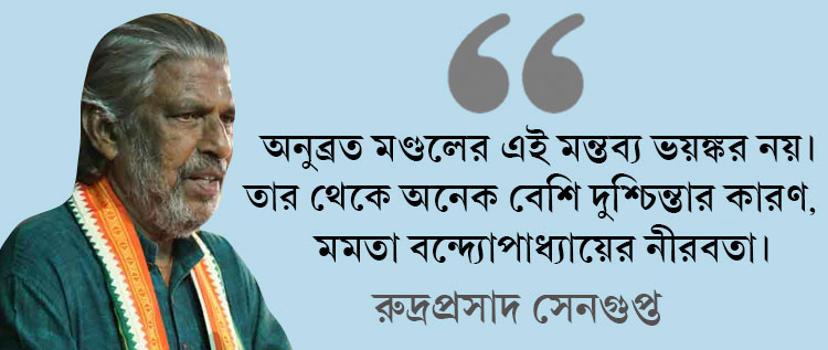 নাট্যব্যক্তিত্ব রুদ্রপ্রসাদ সেনগুপ্তের কথায়: ‘‘আমার কাছে অনুব্রত মণ্ডলের এই মন্তব্য ভয়ঙ্কর নয়। তবে তার চেয়ে অনেক বেশি দুশ্চিন্তার কারণ, তাঁদের সুপ্রিম নেত্রী মমতা বন্দ্যোপাধ্যায়ের নীরবতা।’’ প্রবীণ এই নাট্যব্যক্তিত্বের কথায়: ‘‘মমতা তো কবিতা লেখেন, ছবি আঁকেন। তাঁর এই নীরবতা এই ধরনের ছোট ছোট ঢেউকে টর্নেডোয় পরিণত করবে।’’ অনেকেই বলছেন, অনুব্রত তো আগেও কম বলেননি। রাস্তায় উন্নয়ন দাঁড়িয়ে থাকবে বলে তিনি যখন বিরোধীদের প্রচ্ছন্ন হুমকি দিয়েছিলেন, সে সময় তাঁকে থামালে হয়তোপরিস্থিতি আজকের জায়গায় আসতই না।