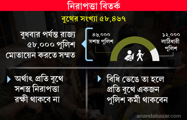 রাজ্য জুড়ে নির্বাচন হবে মোট ৫৮ হাজার ৪৬৭টি বুথে। বুধবার পর্যন্ত রাজ্য সরকার কমিশনকে জানিয়েছে, ভোটের জন্য তারা ৫৮ হাজার পুলিশ কর্মীর ব্যবস্থা করতে পারবে। তার মধ্যে ৪৬ হাজার সশস্ত্র এবং বাকি ১২ হাজার লাঠিধারী। এই হিসেব অনুসারে প্রতিটি বুথে এক জনের বেশি নিরাপত্তরক্ষী মোতায়েন করা সম্ভব নয়। প্রতি বুথে সশস্ত্র পুলিশ মোতায়েন দূর অস্ত্। পুলিশ বাহিনীর স্যান্ডার্ড অপারেটিং প্রসিডিওর (এসওপি) অনুসারে, যেখানেই বাহিনী মোতায়ে করা হোক না কেন, তা জোড় সংখ্যায় করতে হবে। অর্থাৎ কমপক্ষে দু’জন। সে ক্ষেত্রে ২৩ হাজারের বেশি বুথে সশস্ত্র বাহিনী মোতায়েন করা সম্ভব নয়। বিধি ভেঙে কি তা হলে প্রতি বুথে এক জন পুলিশ কর্মী থাকবেন? জল্পনা শুরু হয়ে গিয়েছে।