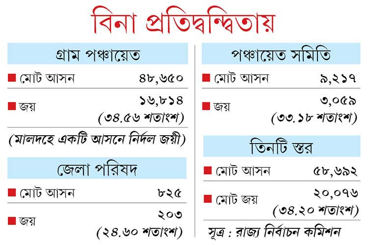 রাজ্যে ১৯৭৮ থেকে ২০১৩ সাল পর্যন্ত পঞ্চায়েত নির্বাচনে মোট বিনা প্রতিদ্বন্দ্বিতায় জয়ী হয়েছিলেন ২৩,১৮৫ জন প্রার্থী। আর শুধু এ বারই ২০ হাজারের বেশি আসনে বিনা প্রতিদ্বন্দ্বিতায় জয়ী হয়েছেন শাসক দলের প্রার্থীরা।